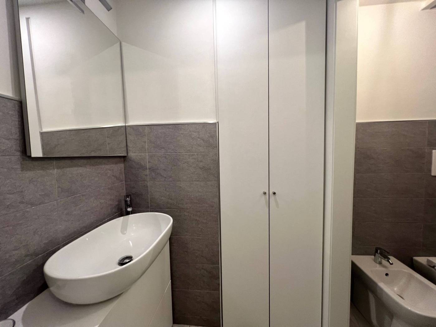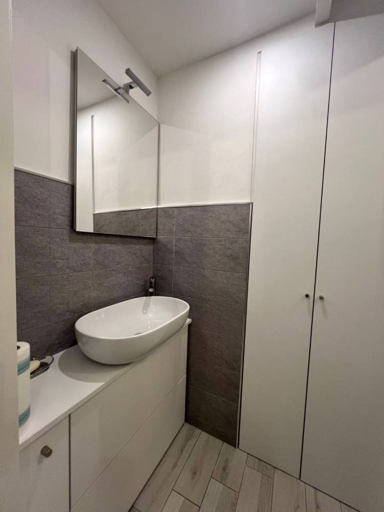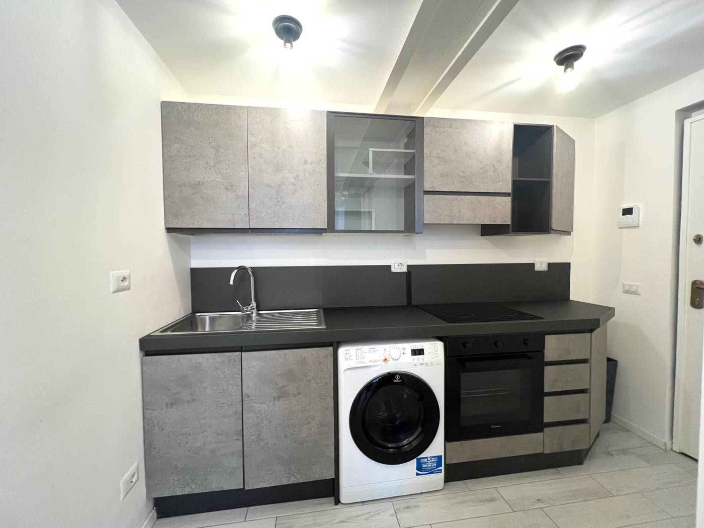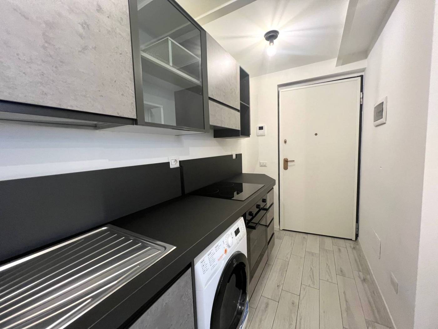 La soluzione abitativa viene venduta completamente ARREDATA, con allestimenti moderni fatti su misura. La cucina é attrezzata con piastre ad induzione, forno, frigo/freezer, lavastoviglie e lavatrice/asciugatrice. La zona pranzo é arredata con tavolo, sedie, mobile dispensa. La camera ospita letto matrimoniale, armadio e scrivania. Anti-bagno con mobile lavabo e bagno con ampia doccia.