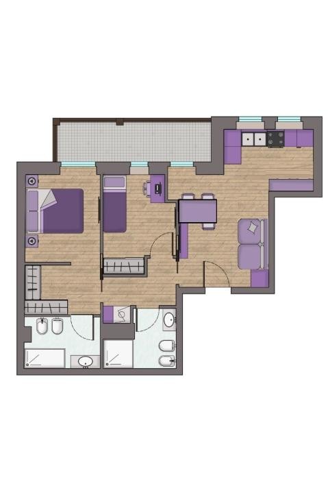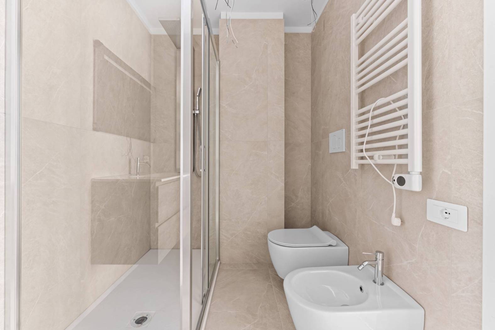 Al suo interno si compone di: ingresso su soggiorno con cucina a vista e ampio balcone, camera matrimoniale (anch'essa con accesso al balcone) con comoda cabina armadio e bagno “en suite”, seconda camera, secondo bagno, nicchia lavanderia e disimpegno.