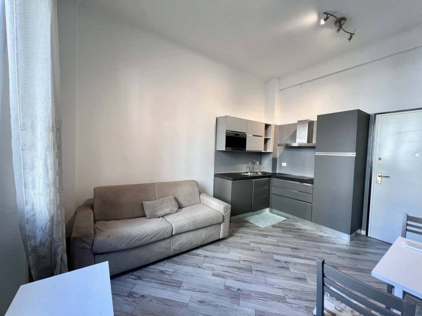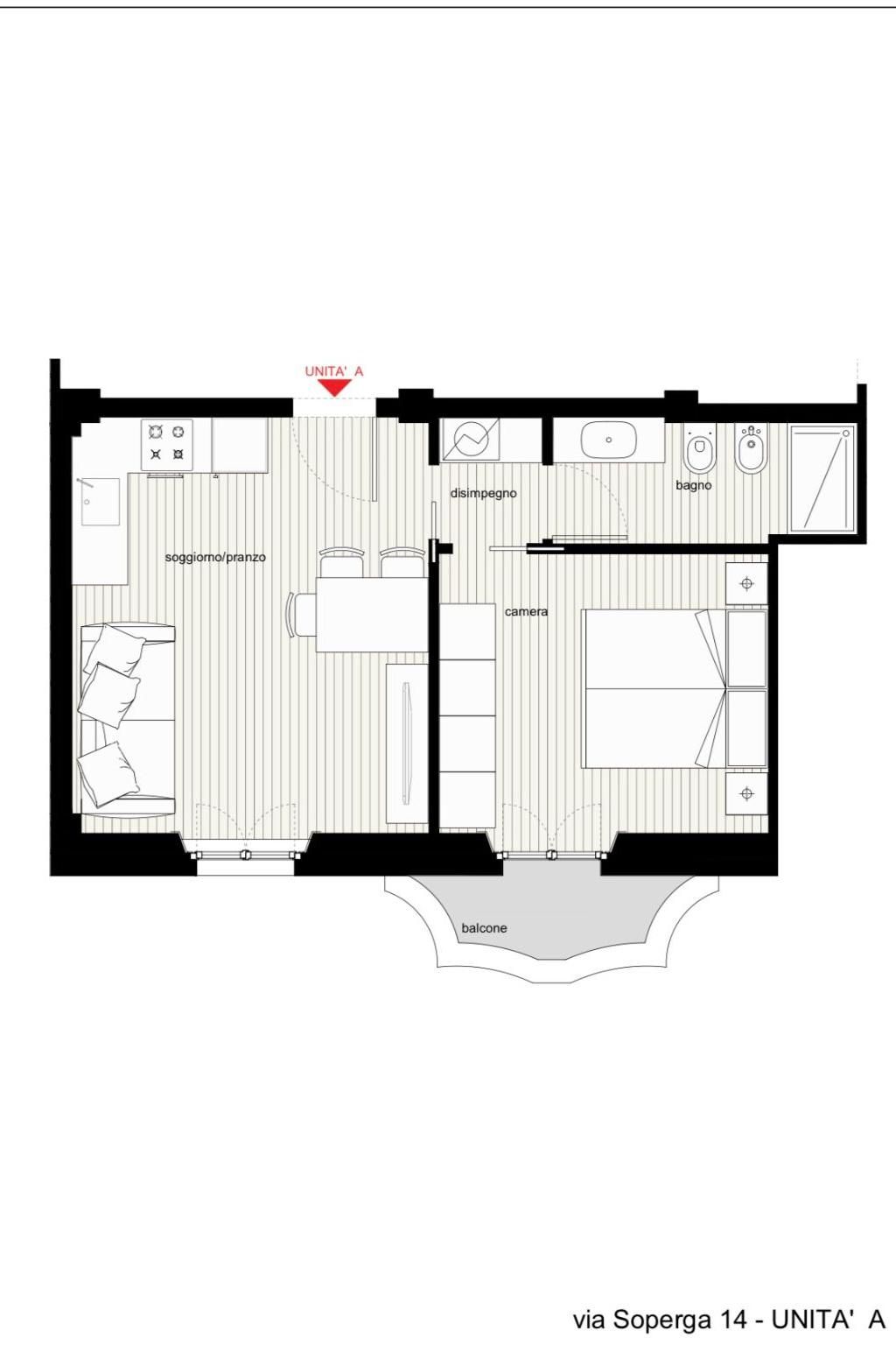 L'appartamento é composto da ingresso su soggiorno con cucina a vista, camera con balcone, disimpegno e bagno.