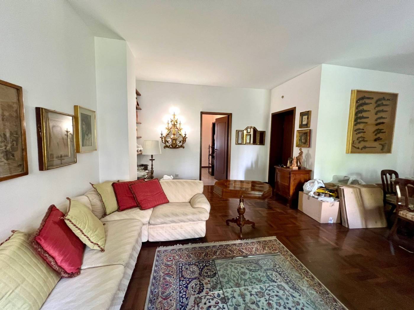 La soluzione abitativa ha due accessi, sul disimpegno d'ingresso e sulla cucina, ed é così composto: ingresso, salone doppio con grande balcone, cucina abitabile, anch'essa con balcone, quattro camere, tre bagni, ripostigli e disimpegni.