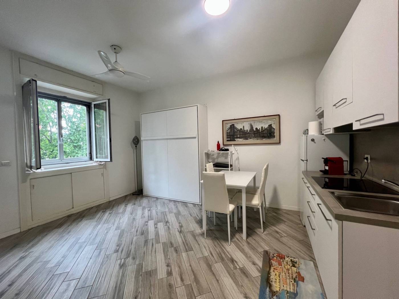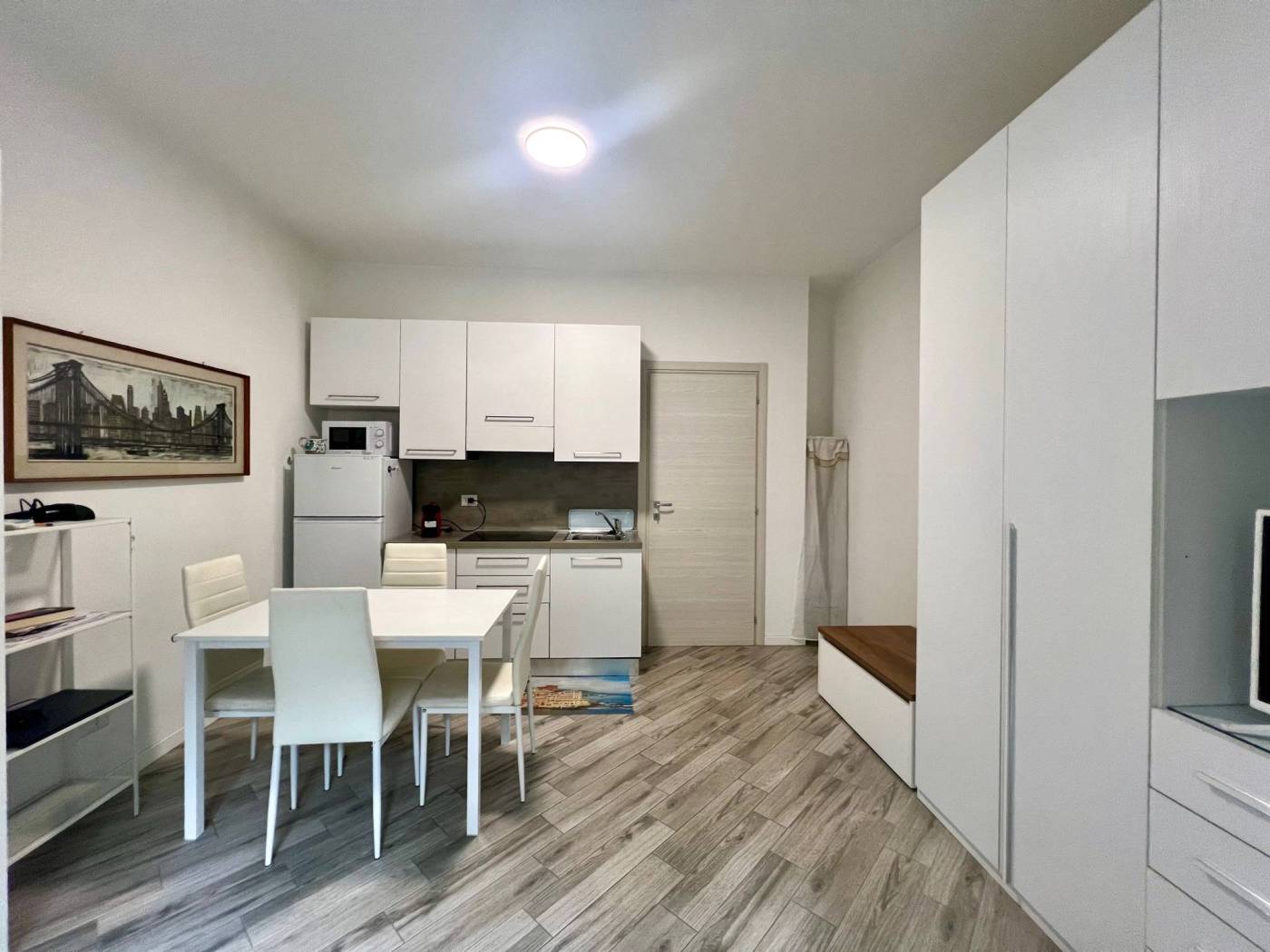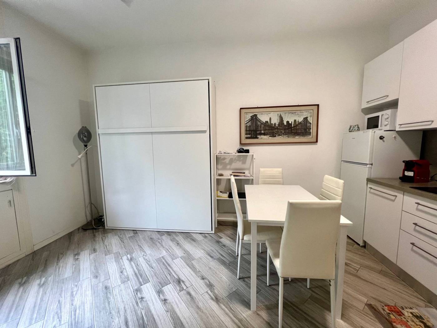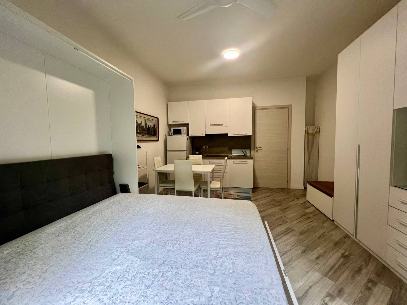 Viene locata completamente arredata con arredi comprensivi di cucina attrezzata con piastre a induzione, frigo/freezer, forno a microonde, TV, tavolo con sedie, letto matrimoniale a scomparsa e comodo armadio.