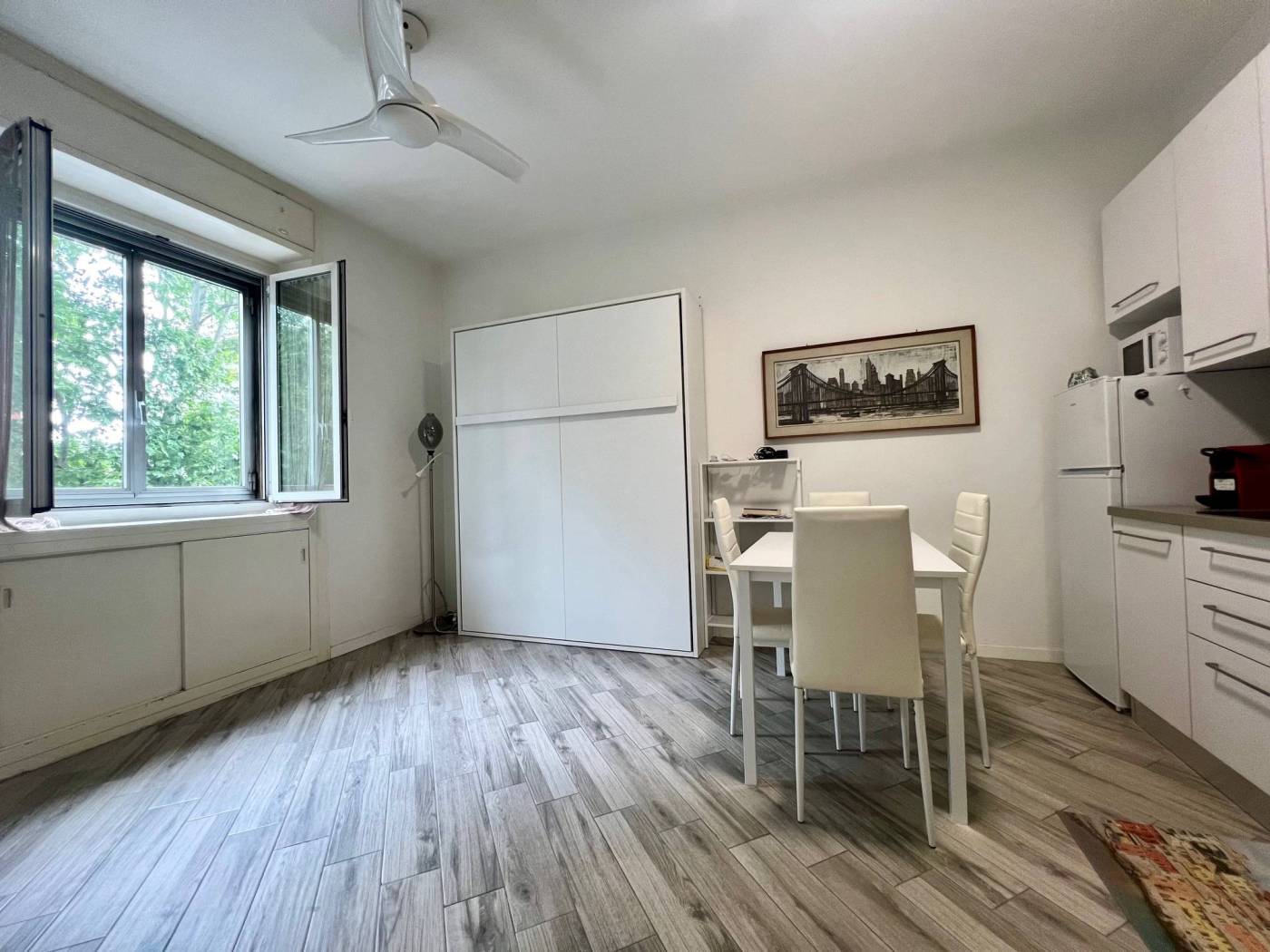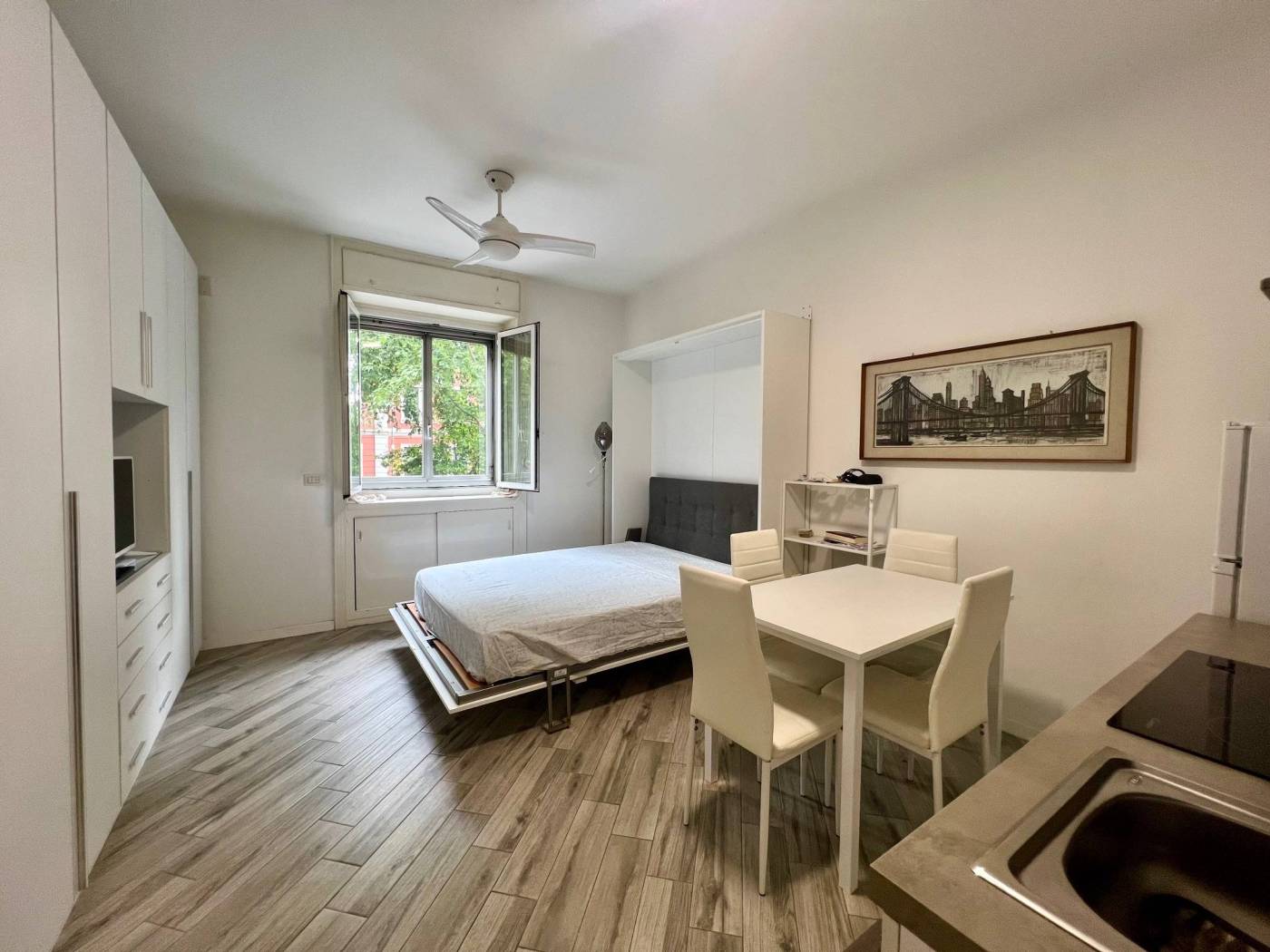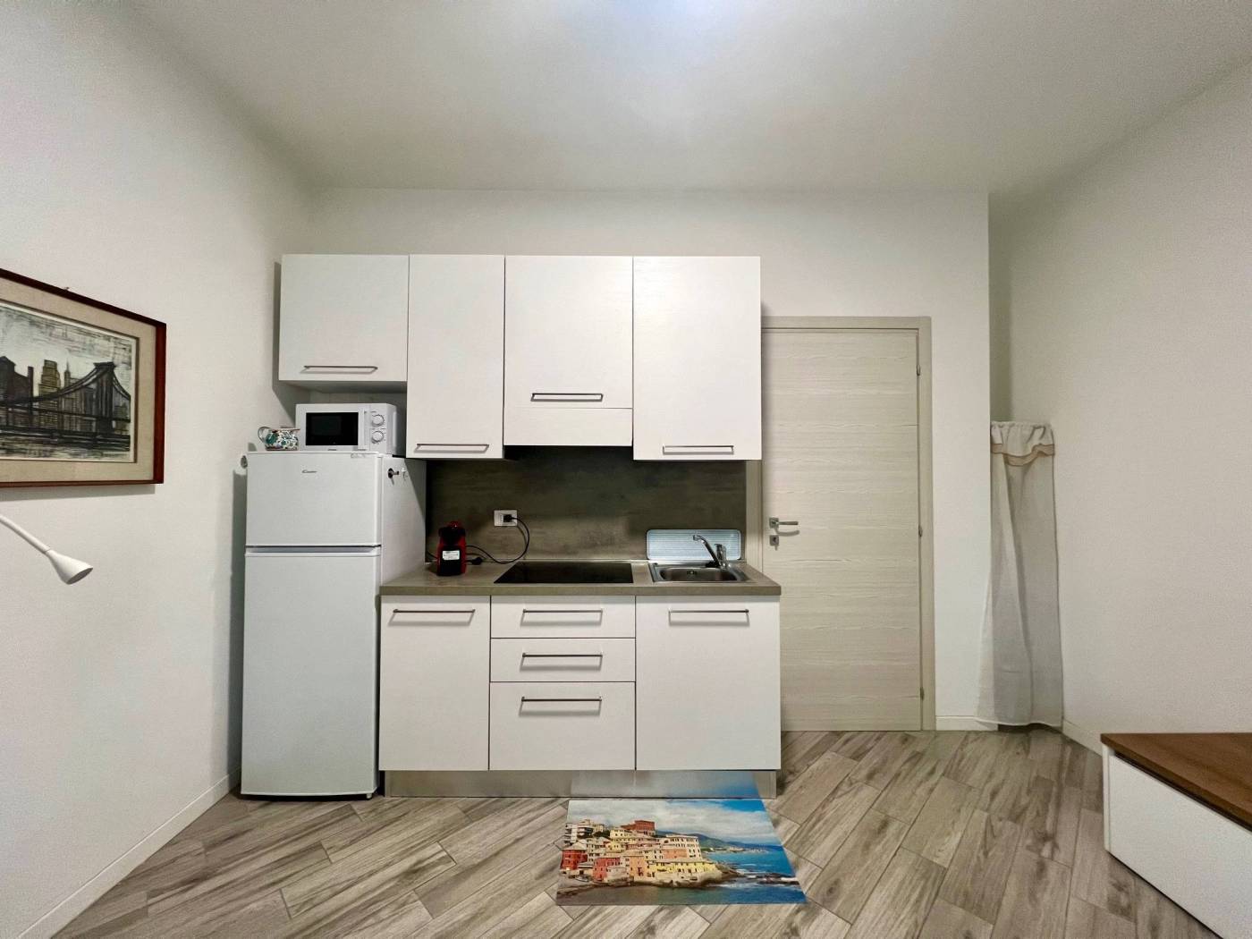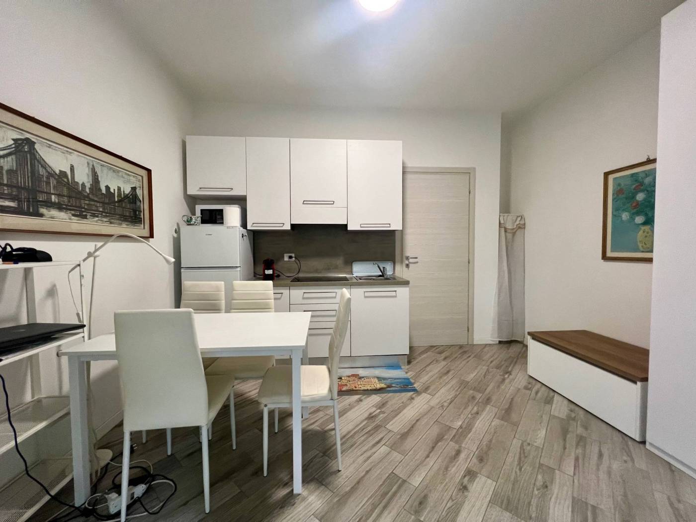 Viene locata completamente arredata con arredi comprensivi di cucina attrezzata con piastre a induzione, frigo/freezer, forno a microonde, TV, tavolo con sedie, letto matrimoniale a scomparsa e comodo armadio.