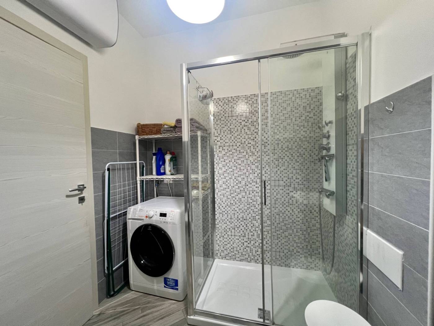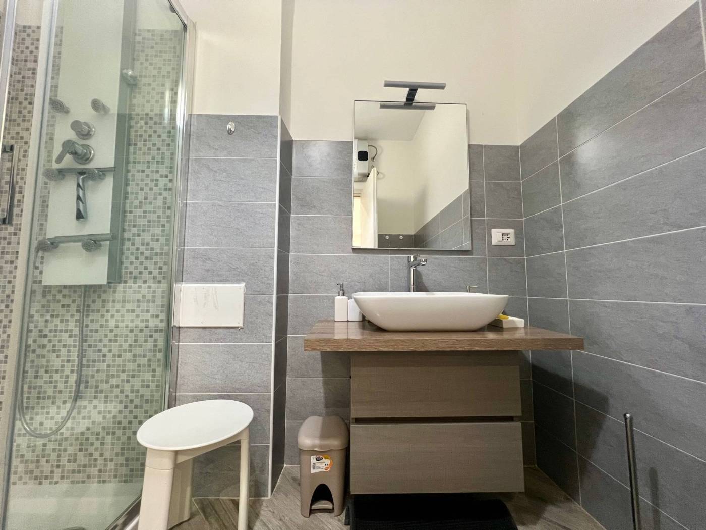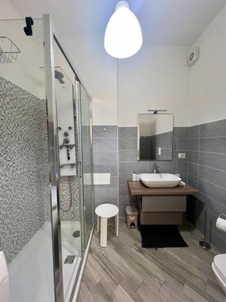 Finiture ottime. Gres porcellanato con venature grigie, serramenti esterni doppi. Grande doccia con colonna idromassaggio.