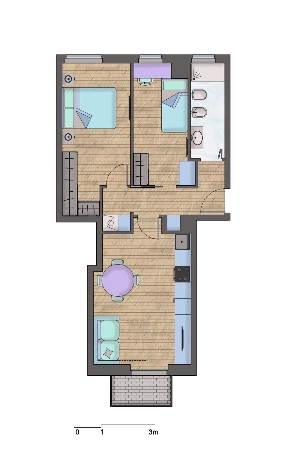 L'appartamento ha superficie commerciale di mq. 70 ed é composto da: spazioso ingresso, soggiorno con cucina a vista e balcone, camera matrimoniale, cameretta/studio, bagno finestrato, disimpegno/lavanderia.